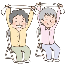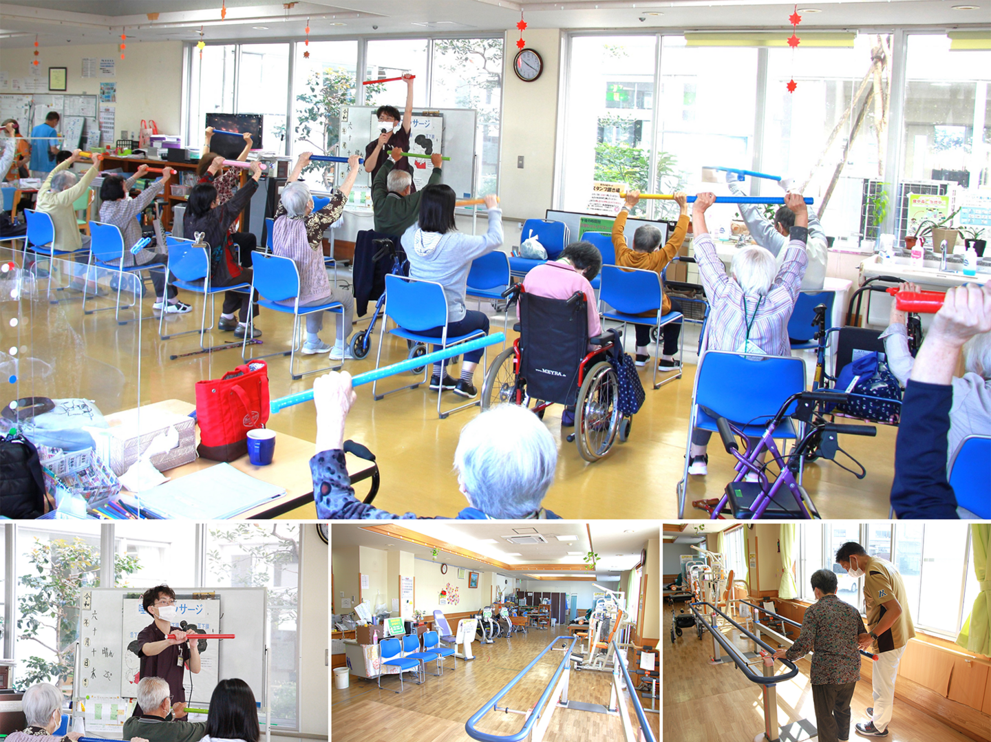 | 集団体操 | 午前と午後、参加者で輪になり、椅子に座ってできる運動を中心に集団体操を行います。メニューも週替わりなので飽きずに参加していただけます。 ※集団体操…ボール体操、棒体操、ウォーターダンベル、ゴムチューブ、モルック、ボッチャ、ステップ運動、ピラティスなどを行います。 |