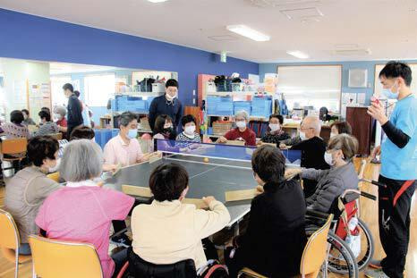 卓球バレーとは、1チーム6人、計12人が卓球台を囲み、車椅子の方は車椅子で、歩ける方は椅子に座りプレーします。ラケットは長方形の板を使い、通常より高く上げたネットの下をボールを転がして打ち合います。障がいのある人も一緒に楽しく身体を動かせるようにと作られたスポーツで子供から高齢者まで楽しめます。白熱したラリーが魅力!!一度、体験すればハマること間違いなし!!
