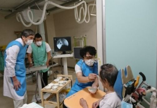 さらに詳細な嚥下状態を見る必要があると判断した場合、嚥下造影検査(VF)を行います。形態や量を変え、バリウムの入った検査食品を食べたり飲んだりして、リアルタイムに口から送り込まれていく様子をレントゲンで観察し、摂食嚥下チームで分析・評価を行います。そして、その人にあった「食事の形態」を提案し、その人にあった「リハビリ」を行います。