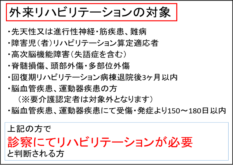 ※当院外来リハビリテーションを開始するには、一度受診していただき、判定が必要となります。