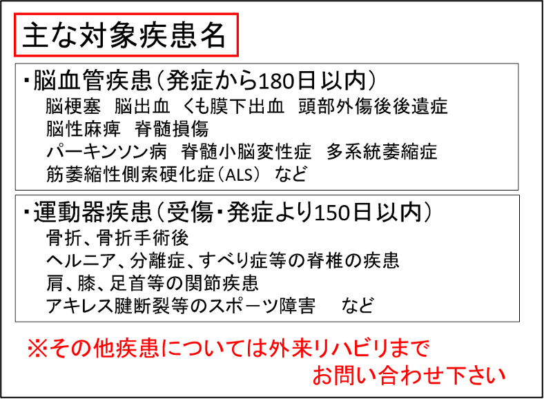 ※介護保険でデイケア、訪問リハビリを利用されている方は制度上併用できませんので御注意下さい。