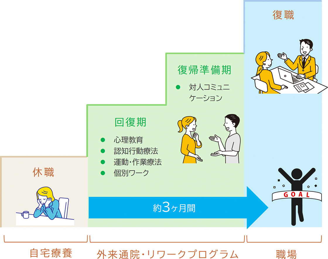 復職だけでなく、職場復帰後の再発・再休職を予防することも目的としています。